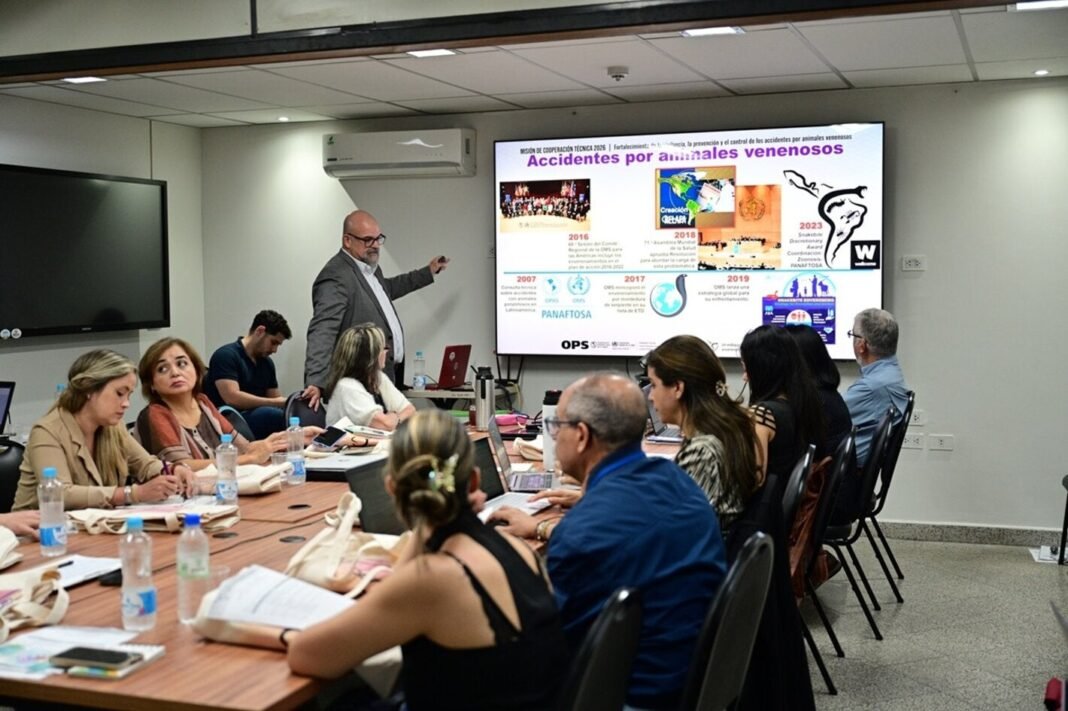 Asunción, 10 de marzo de 2026 (OPS-PANAFTOSA/SPV). – El Ministerio de Salud Pública y Bienestar Social (MSPBS) de Paraguay, con asistencia técnica de la Organización Panamericana de la Salud (OPS) a través de su Centro Panamericano de Fiebre Aftosa y Salud Pública Veterinaria (PANAFTOSA), lleva adelante una capacitación presencial dirigida a profesionales de la salud para fortalecer las capacidades clínicas en el diagnóstico y manejo terapéutico de los envenenamientos ocasionados por serpientes y otros animales venenosos.