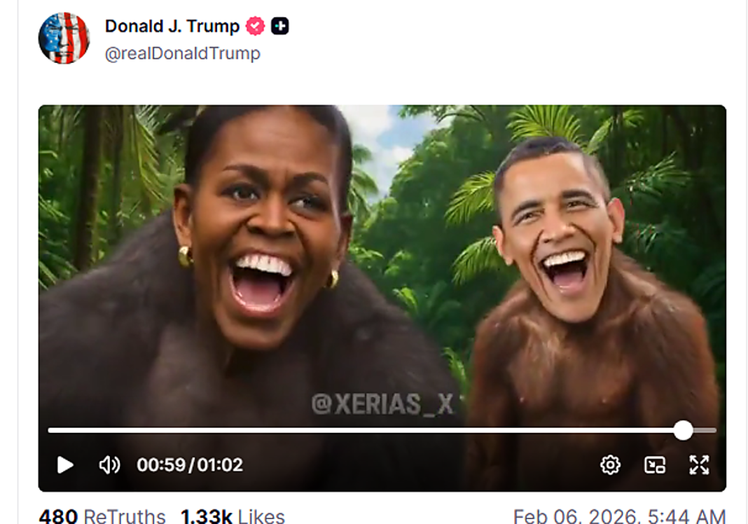 BREAKING: Trump just posted a video on Truth Social that includes a racist image of Barack and Michelle Obama as monkeys.